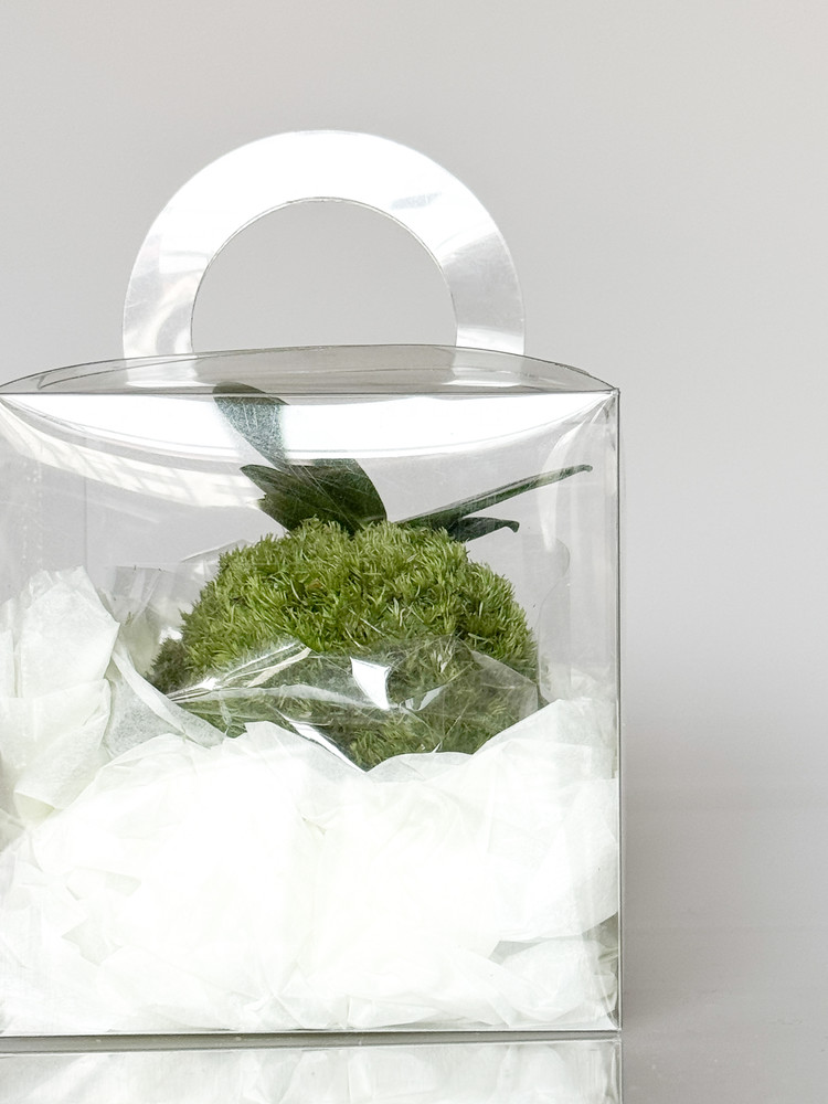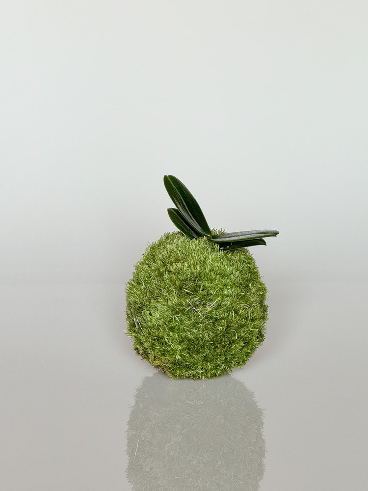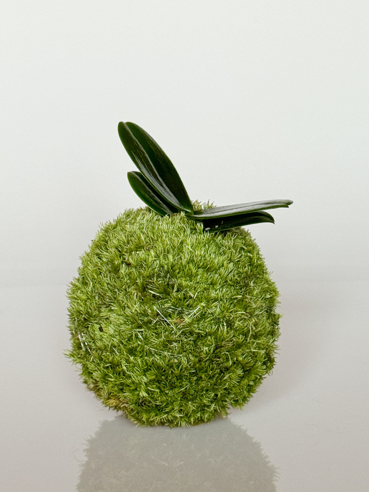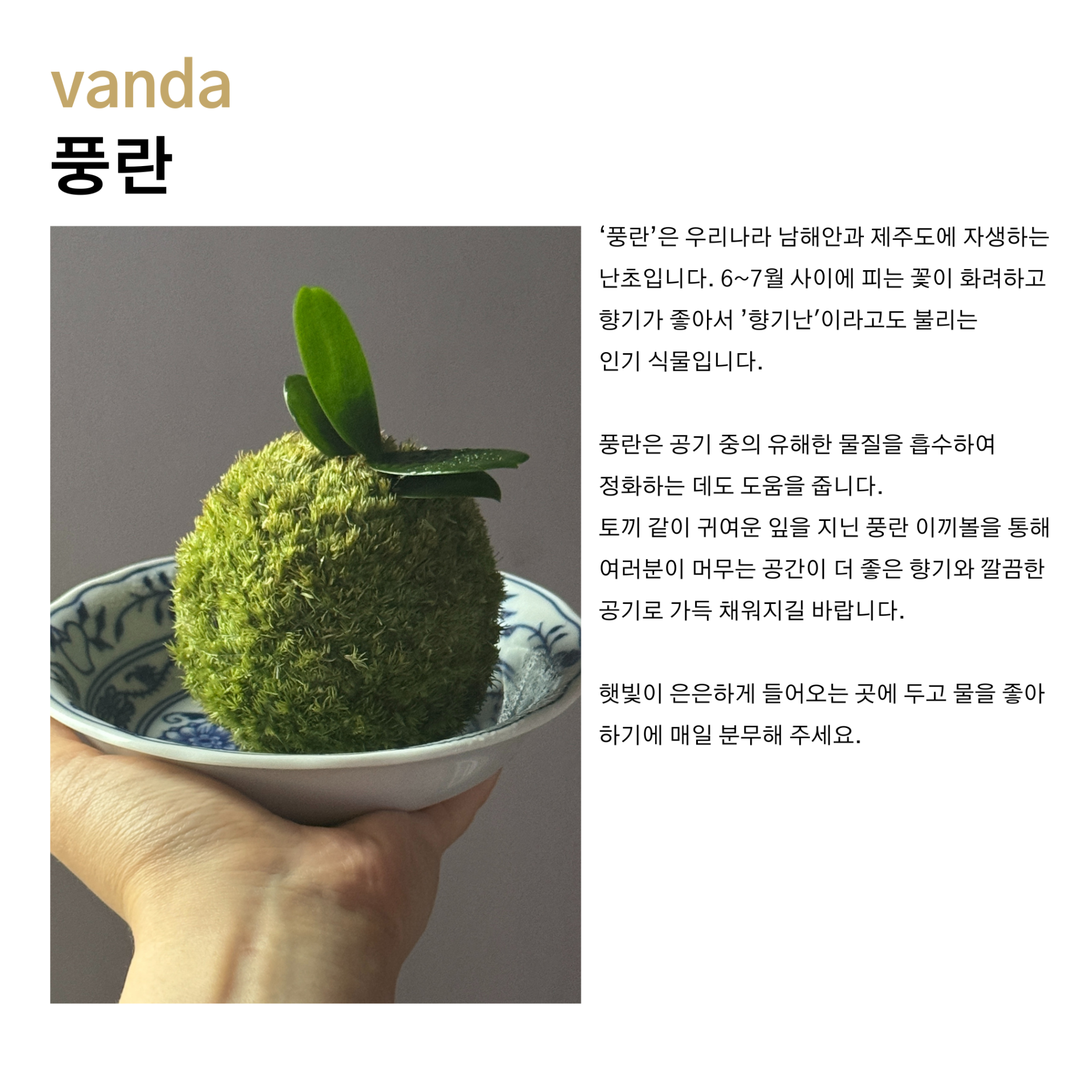공 형태로 수태를 다듬어 고퀄리티 비단이끼로 감쌌습니다. 그리고 중앙에는 풍란을 심었습니다. 이끼와 풍란 모두 공기 정화 식물로 잘 알려져 있습니다. 풍란은 우리나라의 대표적인 난초로 꽃은 5-7월에 피며 아름다운 향기로 오랫동안 사랑받아 왔습니다. 이끼는 피톤치드를 발산하여 좋은 향을 지님과 동시에 미세먼지와 유해가스를 분해합니다.
