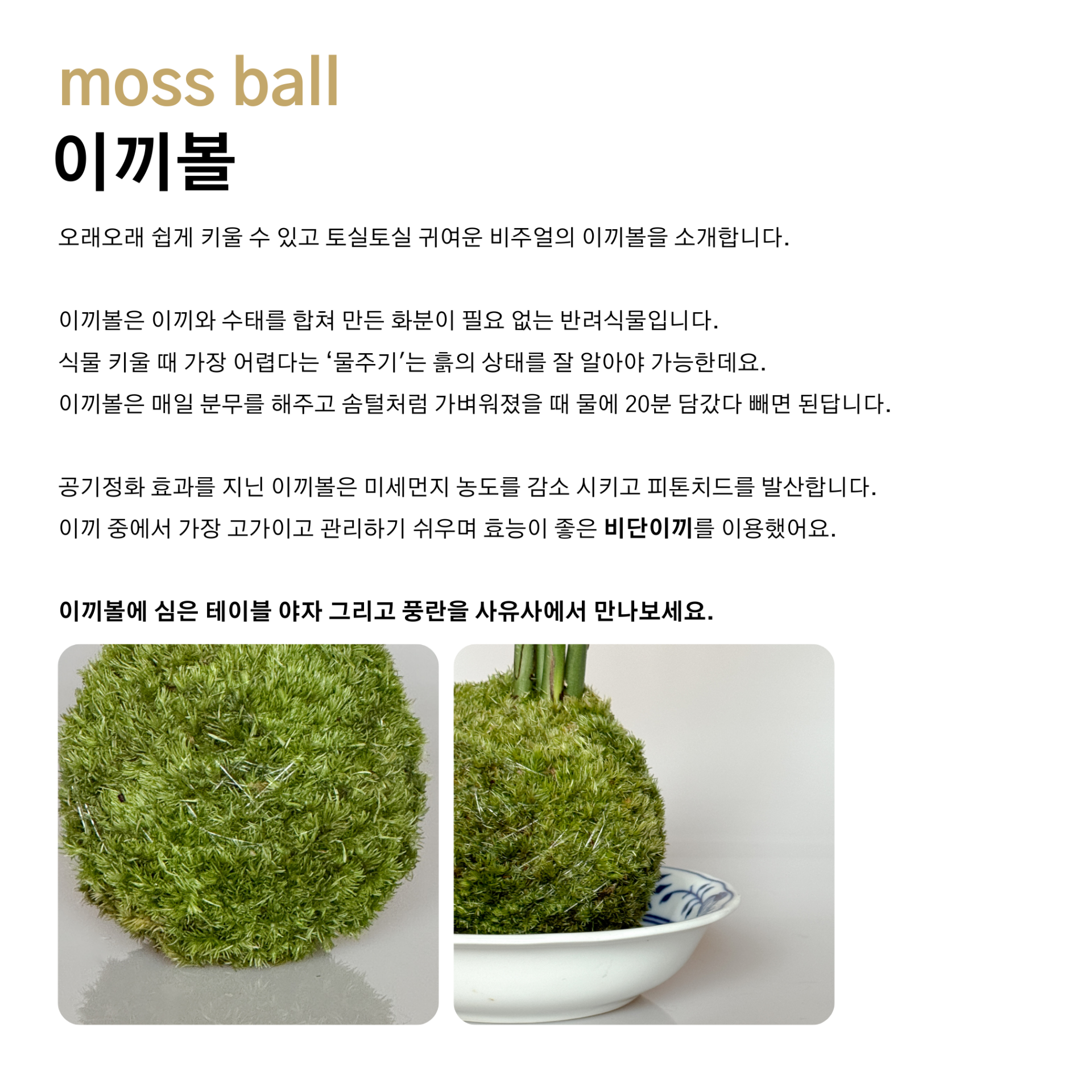 草玉초옥이라고도 불리는 이끼볼은 분재, 화분이 필요 없는 식물입니다. 이끼에 분무하는 것만으로도 오래오래 간단하게 키울 수 있는 반려식물입니다.